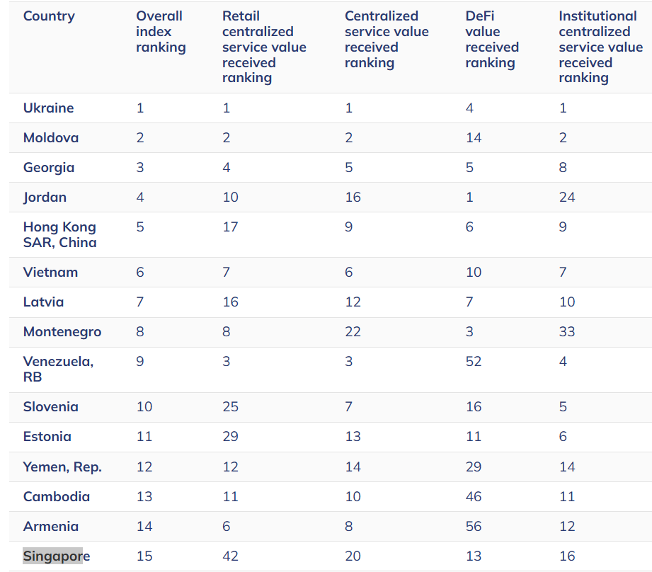 Singapore ranked 15th on the global cryptocurrency adoption index, as compiled by blockchain analytics company Chainalysis.