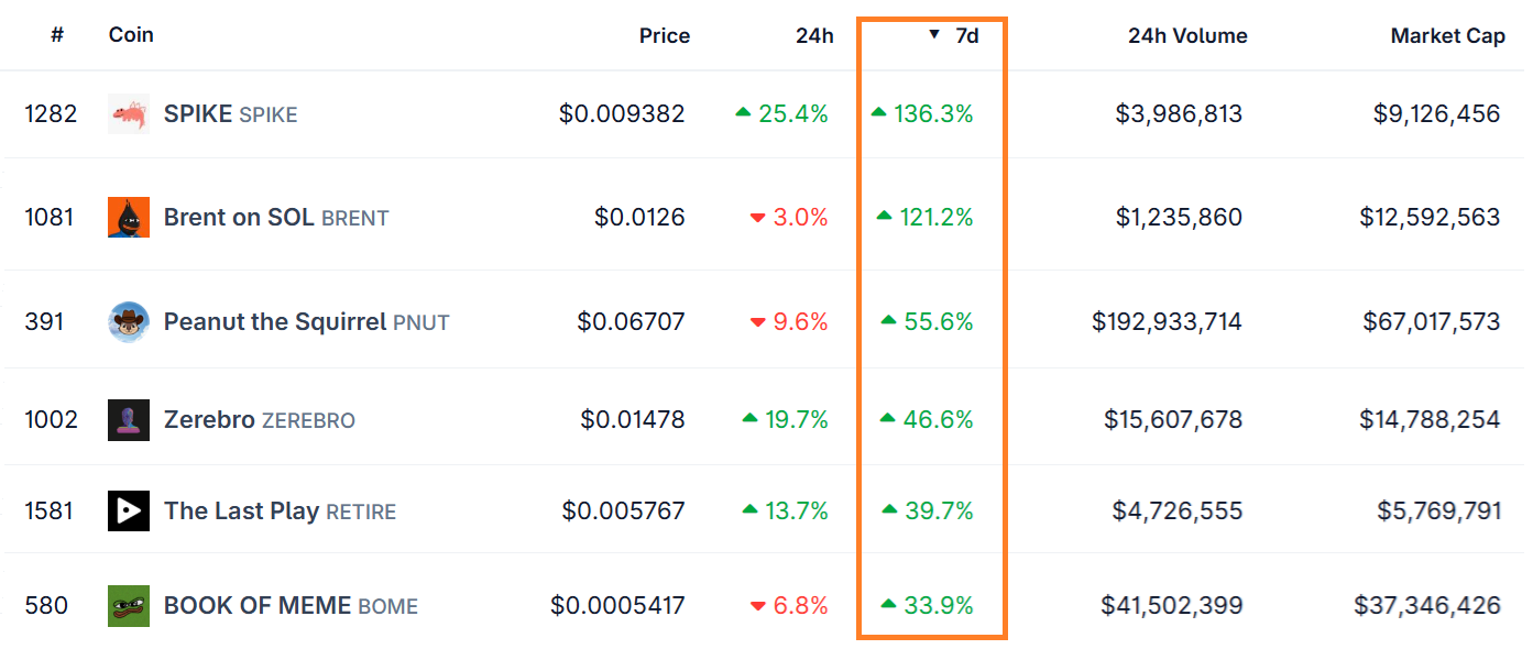 Best performing Solana tokens in 7 days. Source: CoinGecko