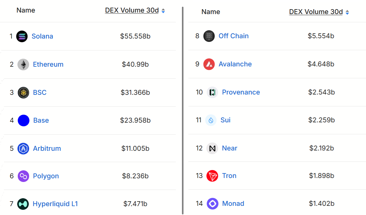 Blockchains ranked by 30-day DEX volumes, USD. Source: DefiLlama