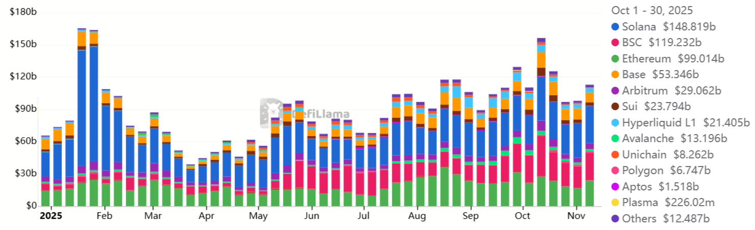 Weekly DEX volumes by chain, USD. Source: DefiLlama