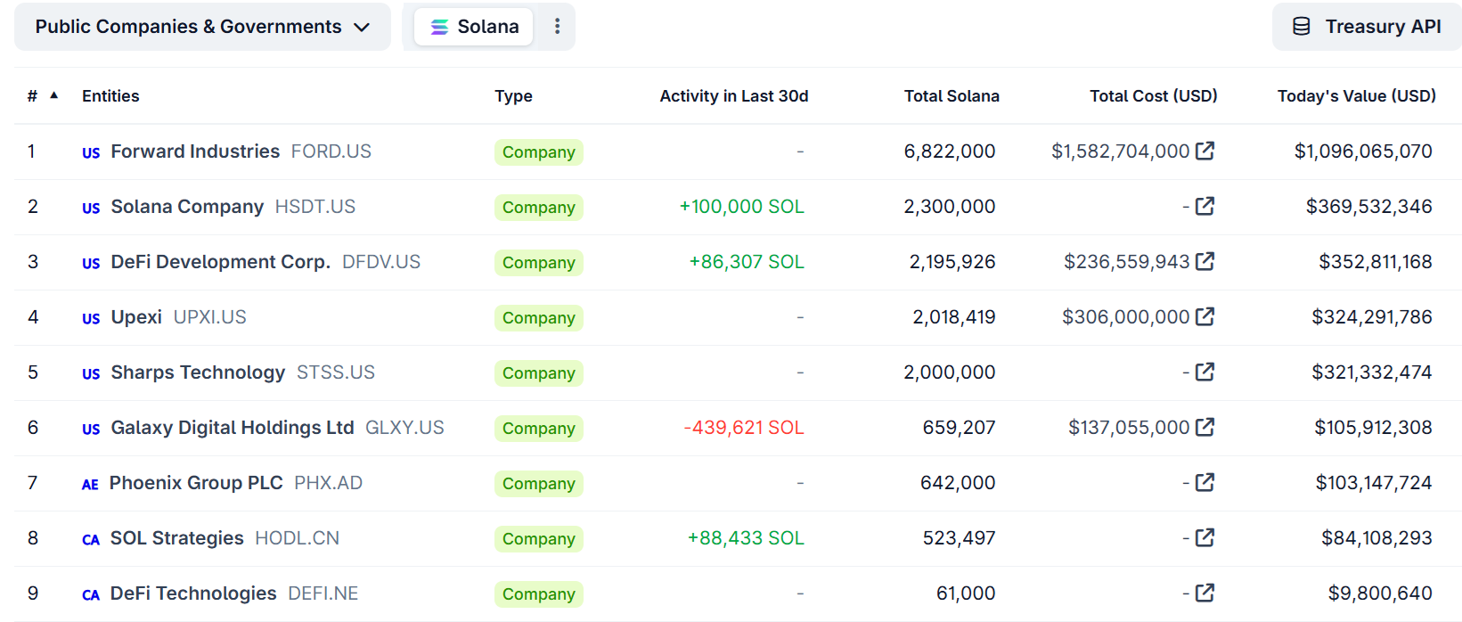 The sale of 439,621 SOL by Galaxy Digital Holdings (GLXY) has raised concerns about the sustainability of Solana’s corporate reserve strategy. Forward Industries (FORD) holds the largest position, with 6.82 million SOL, a figure that has remained steady over the past 30 days, according to CoinGecko data.