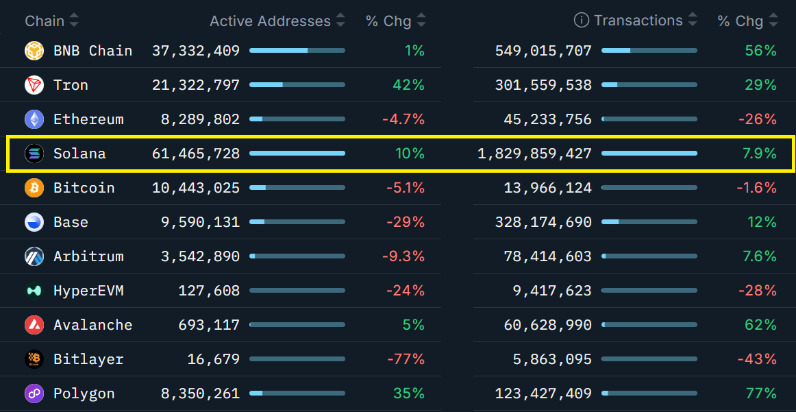 Network activity on Solana has surged over the past 30 days, with active addresses increasing by 10% and transactions rising by 8%. By comparison, Ethereum saw 5% fewer active addresses and a 26% drop in transactions during the same period. Hyperliquid, a rising competitor in the decentralized exchange (DEX) space, also experienced a 28% decline in onchain activity.