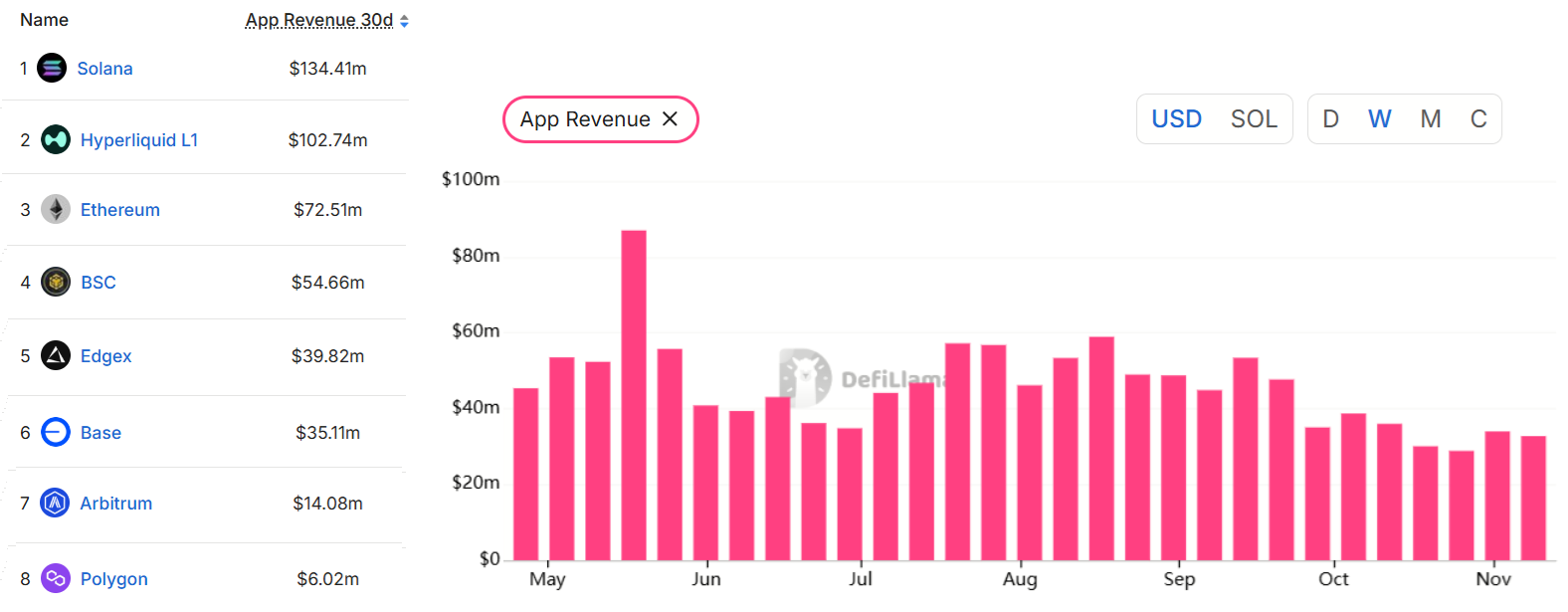 30-day DApp revenue by chain, USD. Source: DefiLlama