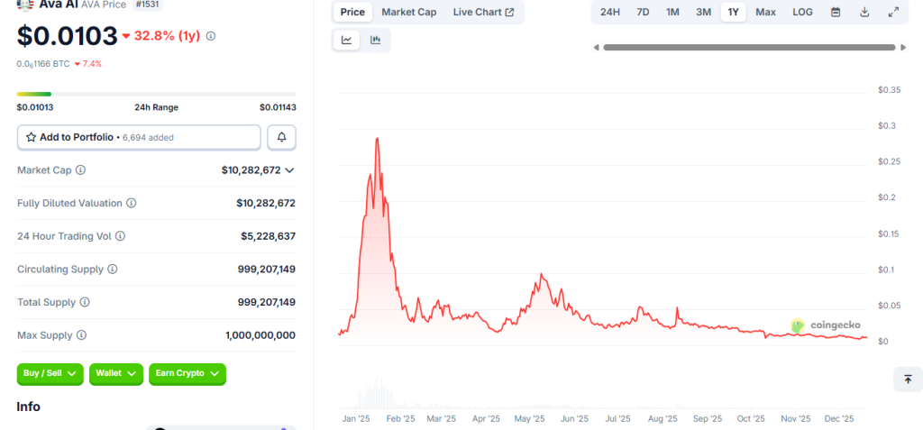AVA is down over 79% from its launch price and more than 96% from its all-time high of about $0.33, reached on Jan. 15, 2025, according to CoinGecko data.