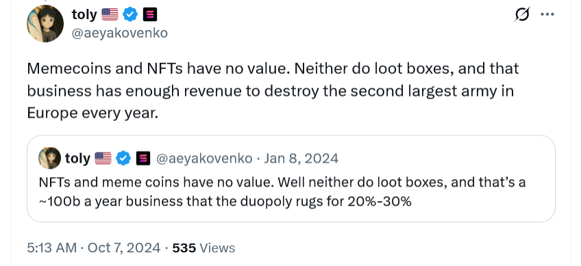 Previous X posts from Yakovenko show that he has held the view that memecoins and NFTs have no value since at least January 2024.