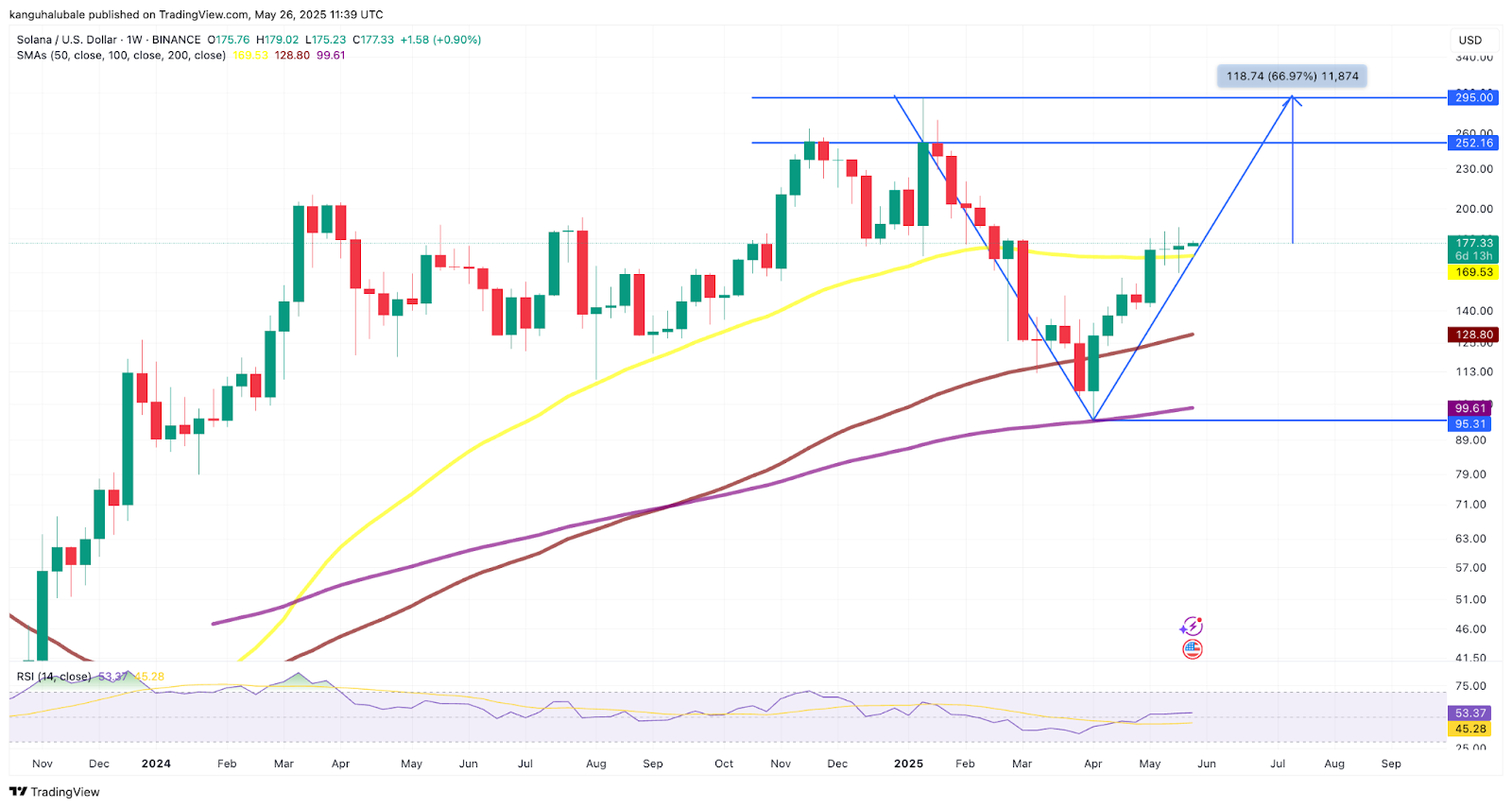 A bullish V-shaped recovery pattern projects SOL price to rise toward $300.
