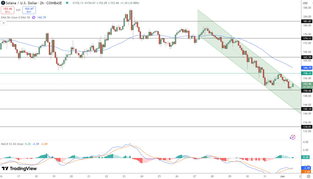Price is approaching the $150.66 support zone, the lower boundary of the channel. If a bullish reversal candle, such as a Hammer or Bullish Engulfing, forms here with MACD convergence, we could see a move to $158.33 or $160.79. But a clean break below $150.66 could take SOL to $142.14 or $134.01.
