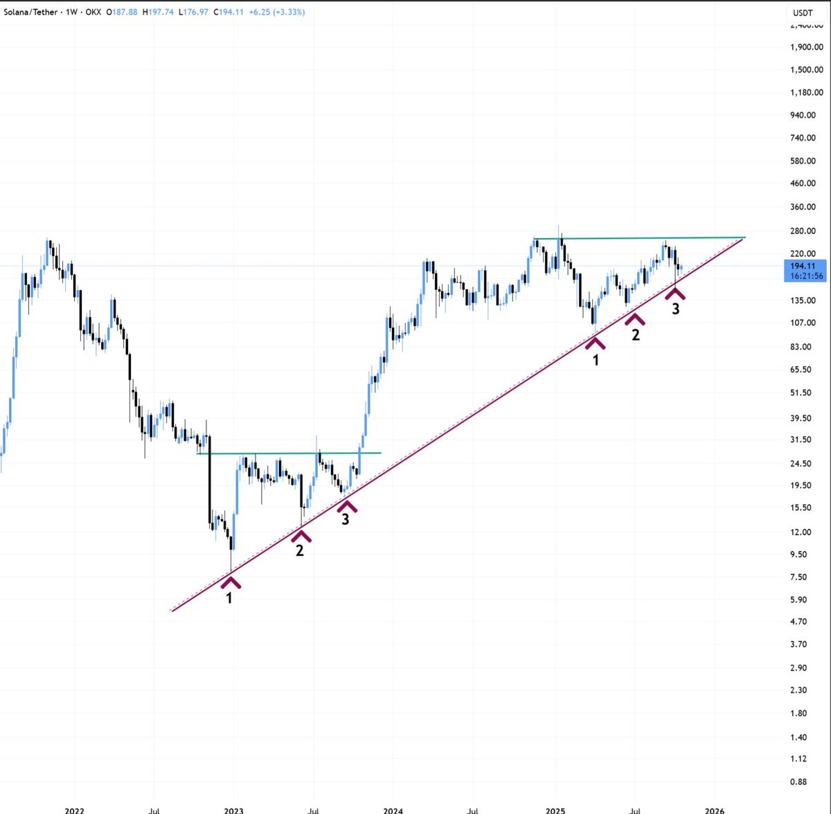 A similar target was set by analyst BitBull, who said “$SOL is still holding its 3-year support trendline,” with the most important level for Solana being $280.