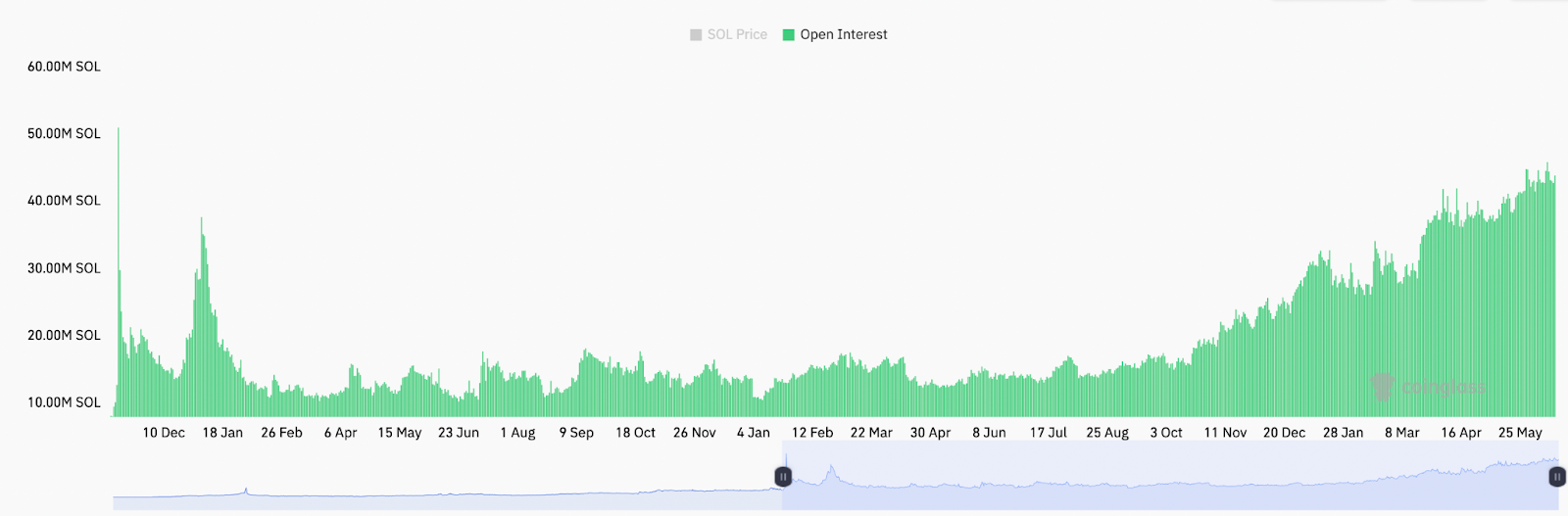 On June 12, total open interest on SOL futures reached 45.87 million SOL, the highest in over two years and up 22% over the last 30 days. The OI remains high at 43.86 million SOL at the time of writing on June 16.