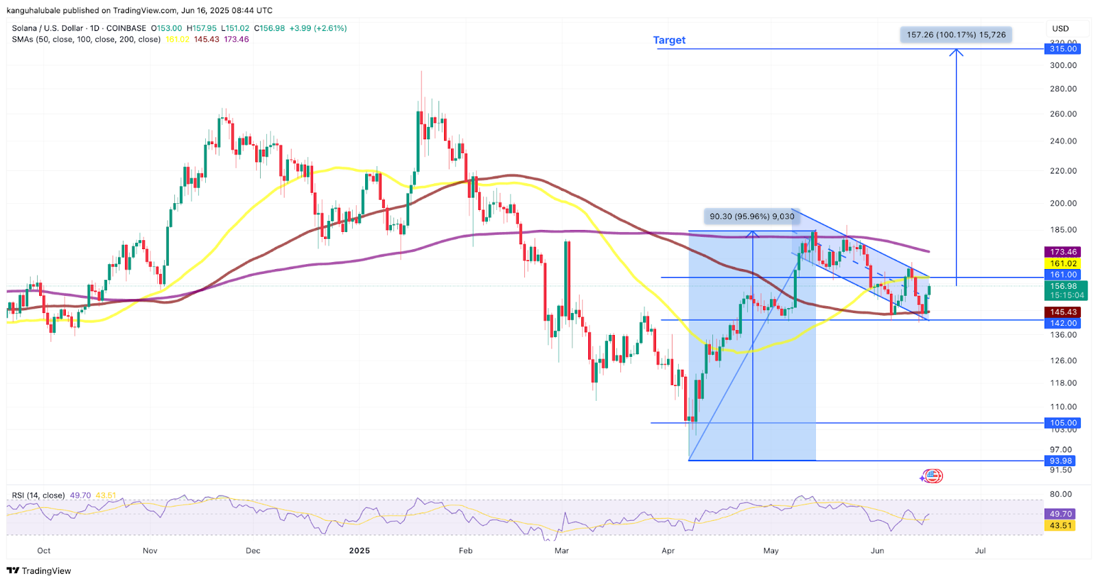 A SOL price bull flag is in play on the daily chart, targeting $315.