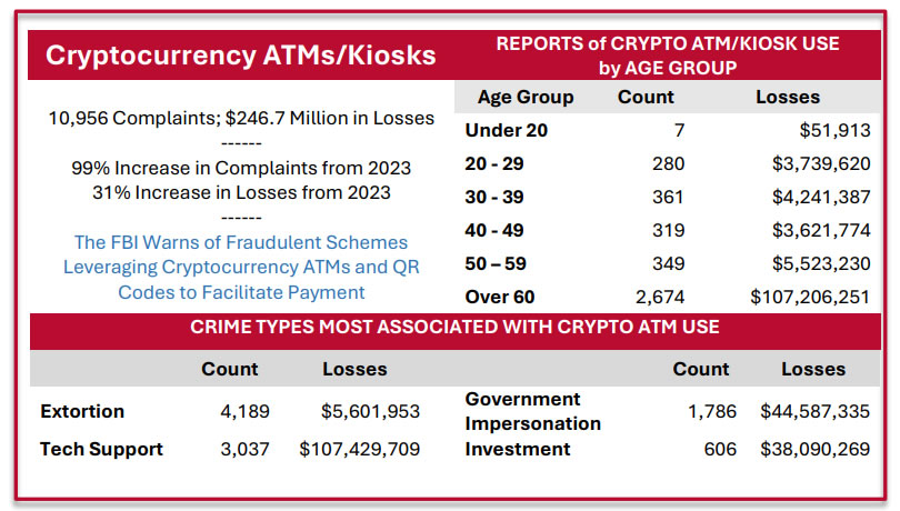 Scammers have also been targeting the elderly, with two-thirds of the victims of crypto kiosk fraud and scams being over 60, it noted.