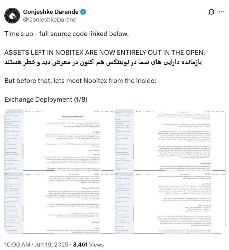 “Time’s up – full source code linked below. ASSETS LEFT IN NOBITEX ARE NOW ENTIRELY OUT IN THE OPEN,” Gonjeshke Darande wrote in an X post on Thursday.