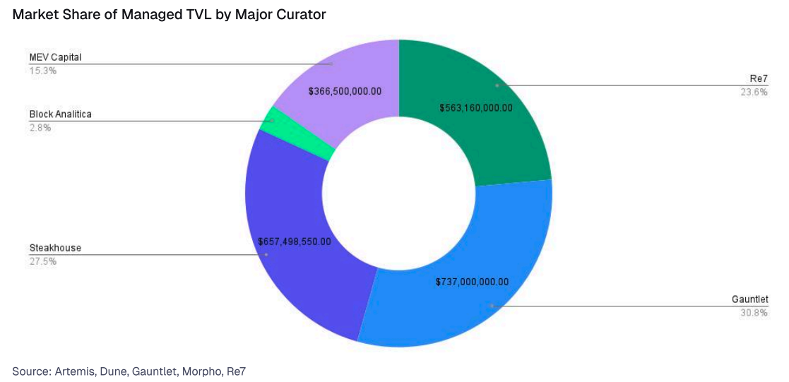Two-thirds of the market share of total value locked by major “crypto-native” asset managers is controlled by Gauntlet, Steakhouse Financial and Re7. Source: Artemis/Vaults