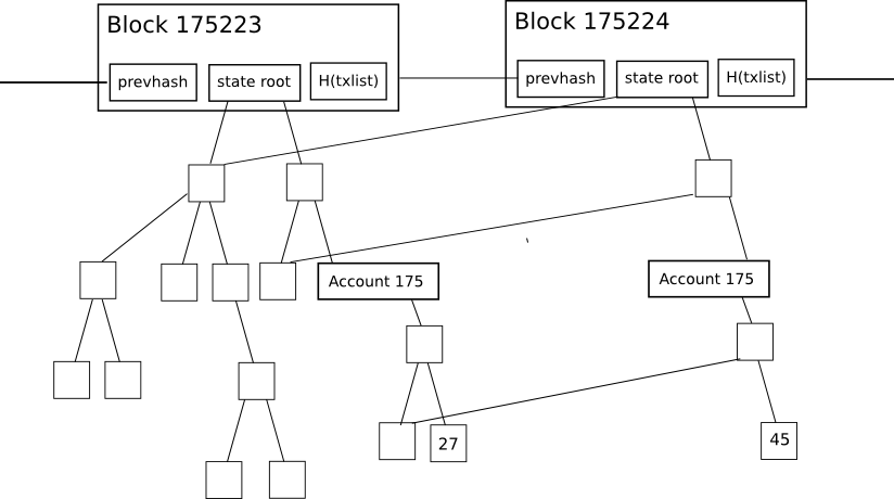 First of all, let us begin by exploring why the current Ethereum client database is so large. Ethereum, unlike Bitcoin, has the property that every block contains something called the “state root”: the root hash of a specialized kind of Merkle tree which stores the entire state of the system: all account balances, contract storage, contract code and account nonces are inside.