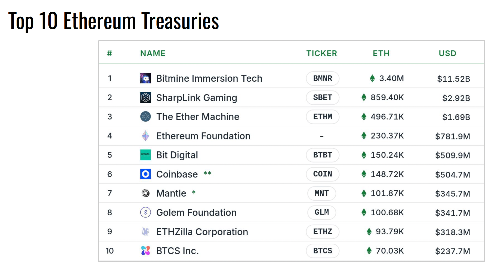 Top corporate Ether holders. Source: BitcoinTreasuries.NET