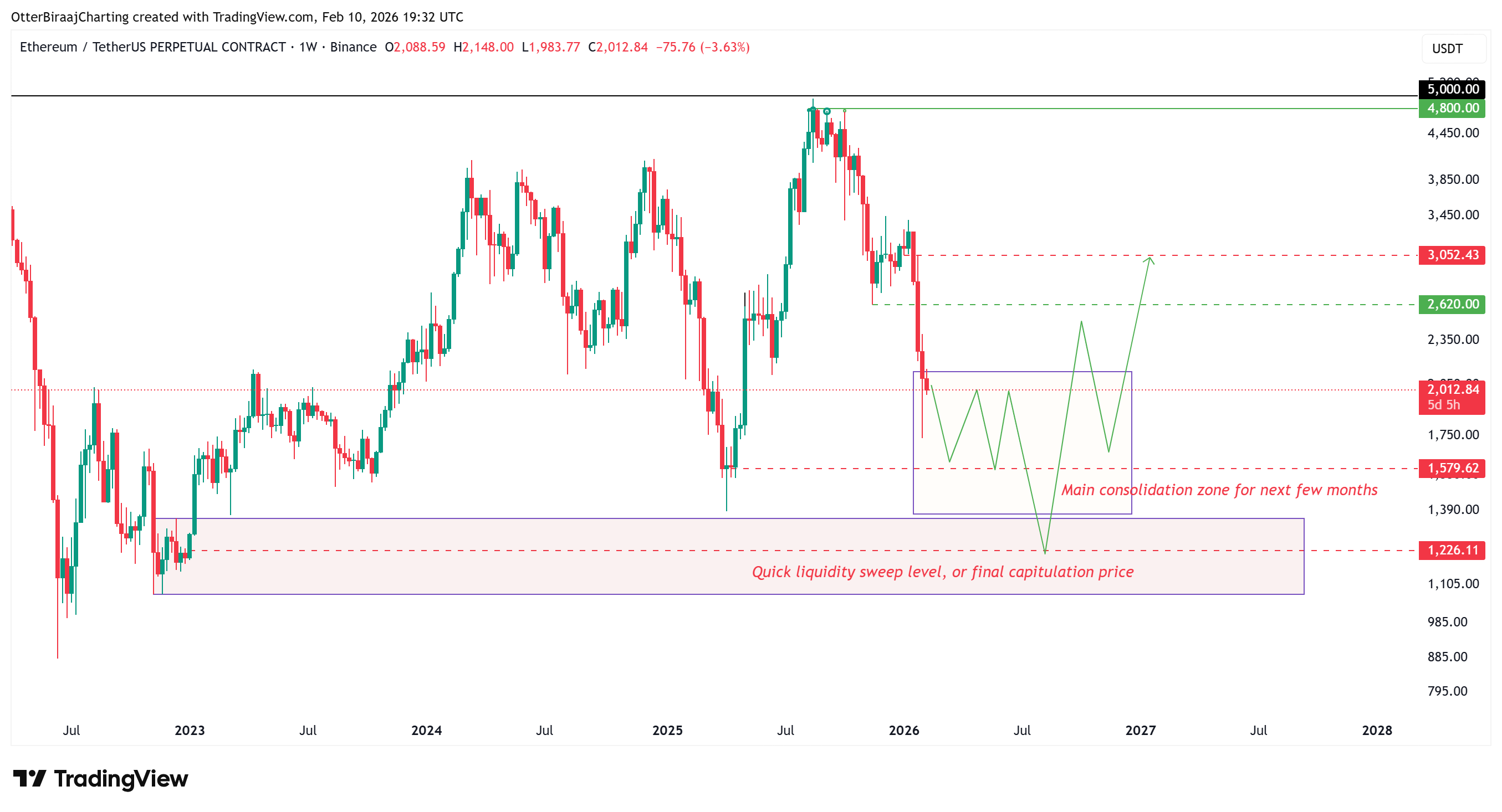 On the weekly chart, ETH’s drop toward the $1,730 region resembles its “first low,” rather than a definitive market floor.