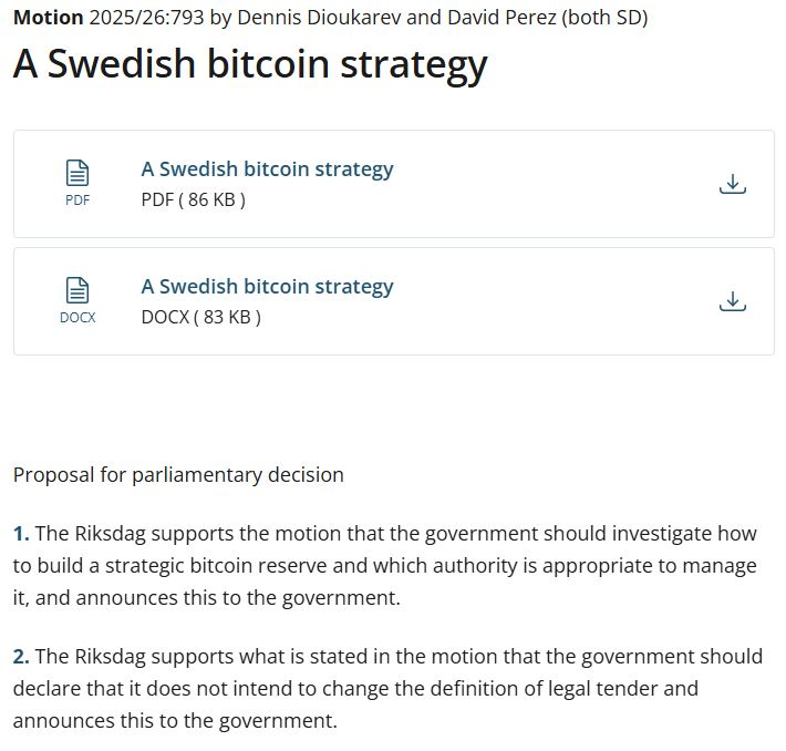 In their proposal to the Riksdag on Wednesday, Swedish Democrats Dennis Dioukarev and David Perez said that, given other countries like the US are already in the process of creating a reserve, Sweden should “participate in this digital arms race and join the growing group of nations that have accepted and recognized the potential of Bitcoin.”
