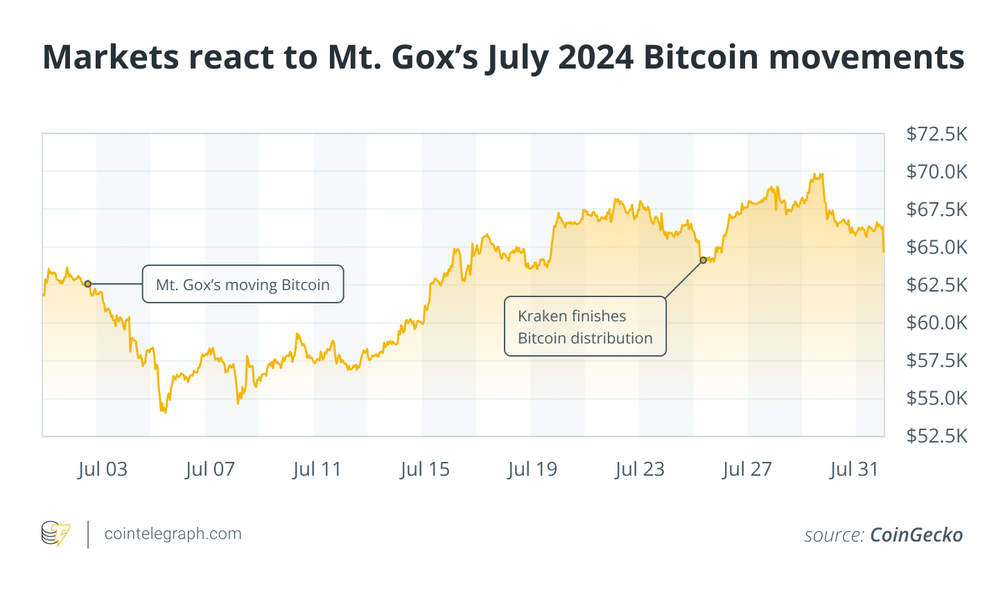 In early July, Mt. Gox wallets began moving Bitcoin as the exchange prepared for creditor repayments under the civil rehabilitation plan. Markets initially feared that recipients would immediately sell. Bitcoin dipped again after Kraken, one of the exchanges handling distributions, announced on July 24 that it had completed its process.