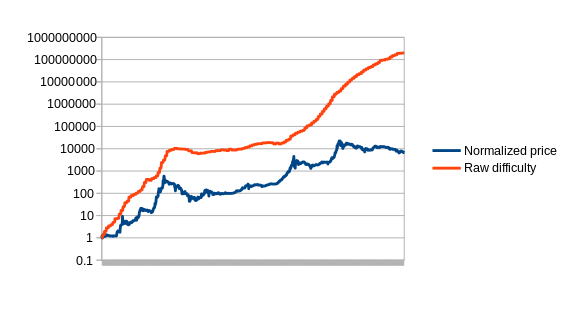 First, let us set up the problem. Formally, we define an estimator to be a function which receives a data feed of some input variable (eg. mining difficulty, transaction cost in currency units, etc) D[1], D[2], D[3]…, and needs to output a stream of estimates of the currency’s price, P[1], P[2], P[3]… The estimator obviously cannot look into the future; P[i] can be dependent on D[1], D[2] … D[i], but not D[i+1]. Now, to start off, let us graph the simplest possible estimator on Bitcoin, which we’ll call the naive estimator: difficulty equals price.