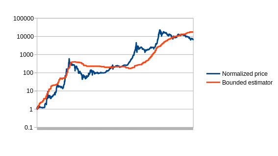 The next estimator that we will explore is the bounded estimator. The way the bounded estimator works is somewhat more complicated. By default, it assumes that all growth in difficulty is due to Moore’s law. However, it assumes that Moore’s law cannot go backwards (ie. technology getting worse), and that Moore’s law cannot go faster than some rate – in the case of our version, 5.88% per two weeks, or roughly quadrupling every year. Any growth outside these bounds it assumes is coming from price rises or drops. Thus, for example, if the difficulty rises by 20% in one period, it assumes that 5.88% of it is due to technological advancements, and the remaining 14.12% is due to a price increase, and thus a stabilizing currency based on this estimator might increase supply by 14.12% to compensate. The theory is that cryptocurrency price growth to a large extent happens in rapid bubbles, and thus the bounded estimator should be able to capture the bulk of the price growth during such events.