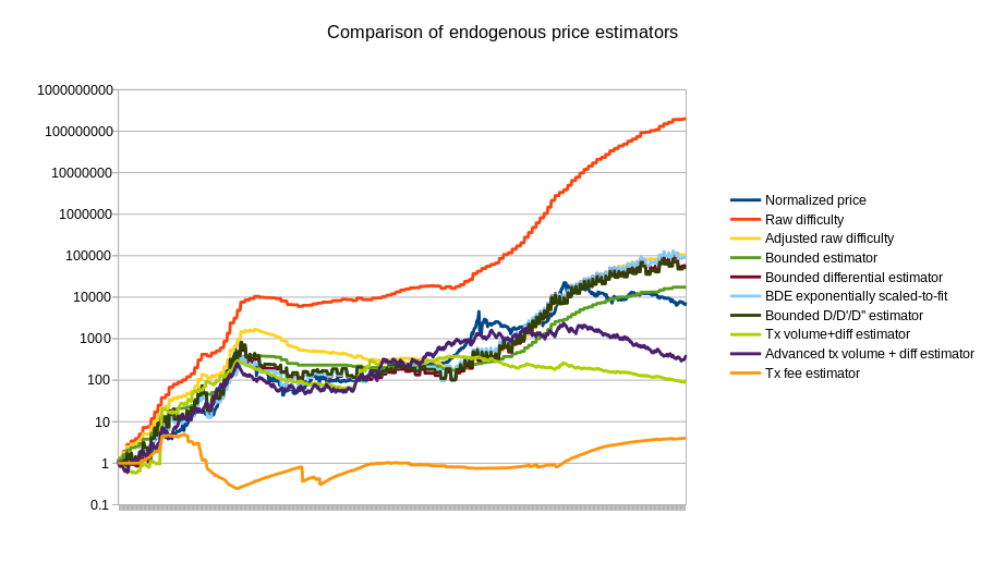 Of course, this is only the beginning of endogenous price estimator theory; a more thorough analysis involving dozens of cryptocurrencies will likely go much further. The best estimators may well end up using a combination of different measures; seeing how the difficulty-based estimators overshot the price in 2014 and the transaction-based estimators undershot the price, the two combined could end up being substantially more accurate. The problem is also going to get easier over time as we see the Bitcoin mining economy stabilize toward something closer to an equilibrium where technology improves only as fast as the general Moore’s law rule of 2x every 2 years.