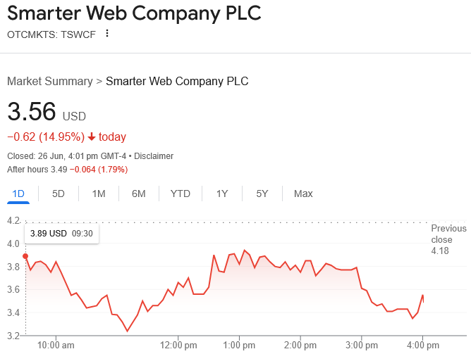 Shares in Smarter Web Company PLC (TSWCF) fell by 15% and closed Thursday at $3.56 after hitting an intraday low of $3.19, according to Google Finance.