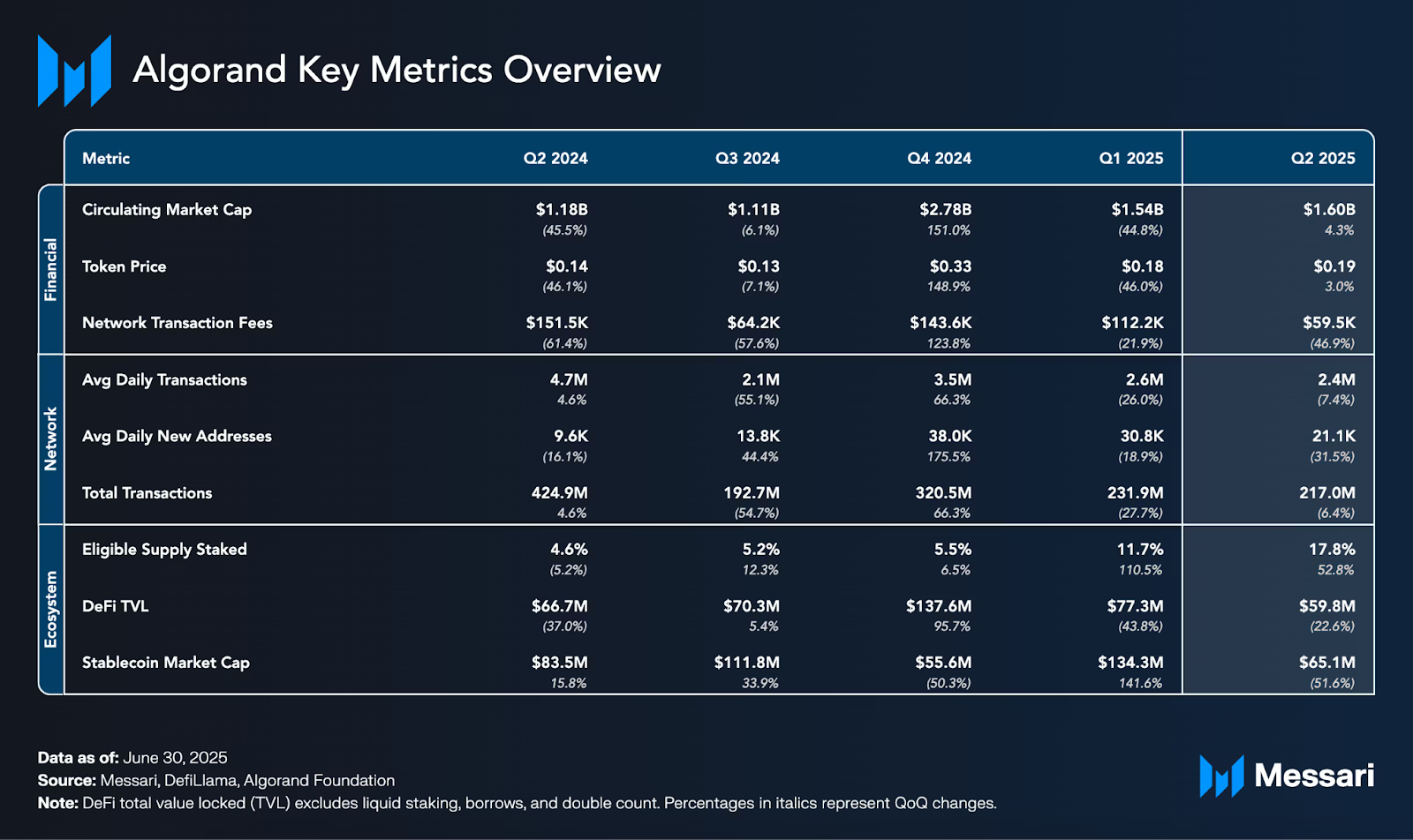 Despite the token’s poor performance after January, Algorand continued to see growing blockchain activity, as the amount of staked ALGO grew 28% quarter-over-quarter, to surpass 1.95 billion ALGO tokens in the second quarter of 2025, according to a Messari research report.