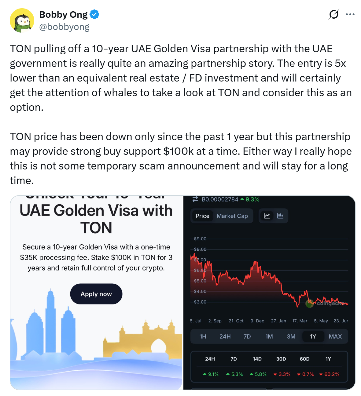 “The entry is 5x lower than an equivalent real estate / FD investment and will certainly get the attention of whales to take a look at TON and consider this as an option,” Bobby Ong, co-founder of CoinGecko, wrote on X.