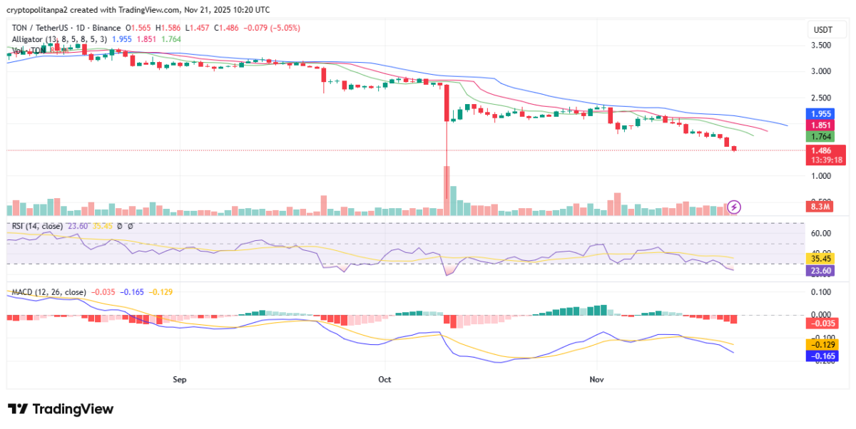 On November 21, TON’s price fell by 13.03% in 24 hours and 30.52% in the last 30 days, as it traded in a bear market. Its trading volume rose by 74.28% to $225.68M in 24 hours as market sell-offs triggered liquidations.
