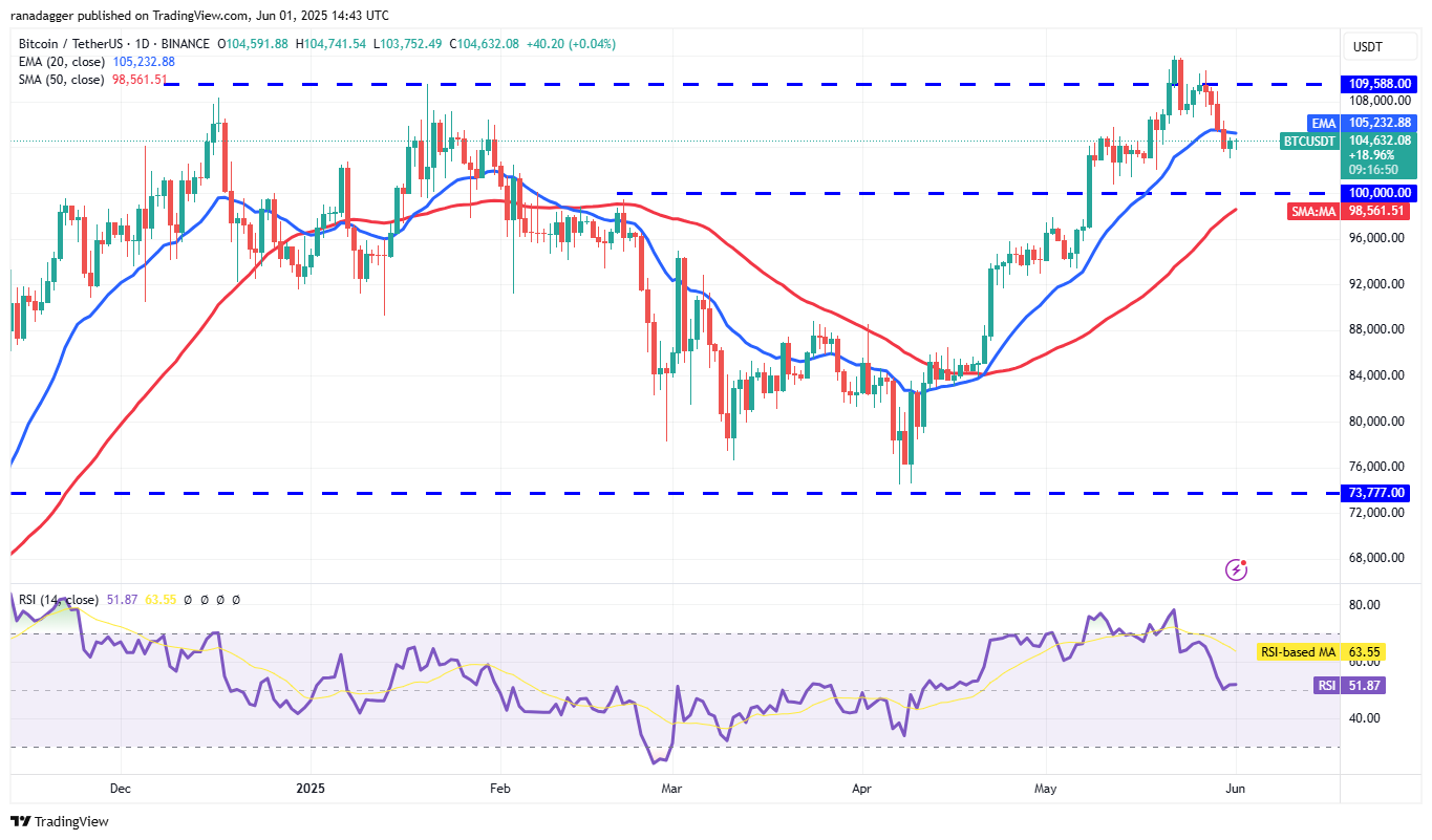 The bulls are trying to push the price back above the 20-day EMA but are likely to face selling at higher levels. If the price turns down from the 20-day EMA, the BTC/USDT pair could drop to $100,000. The bulls are expected to defend the $100,000 level with all their might because a drop below it may start a downtrend toward $93,000.