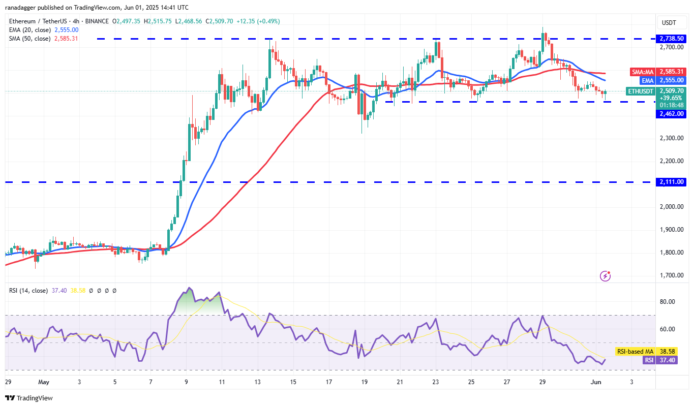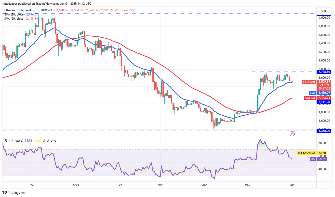 Ether has pulled back to the 20-day EMA ($2,496) after failing to sustain above the overhead resistance of $2,738 on May 29.