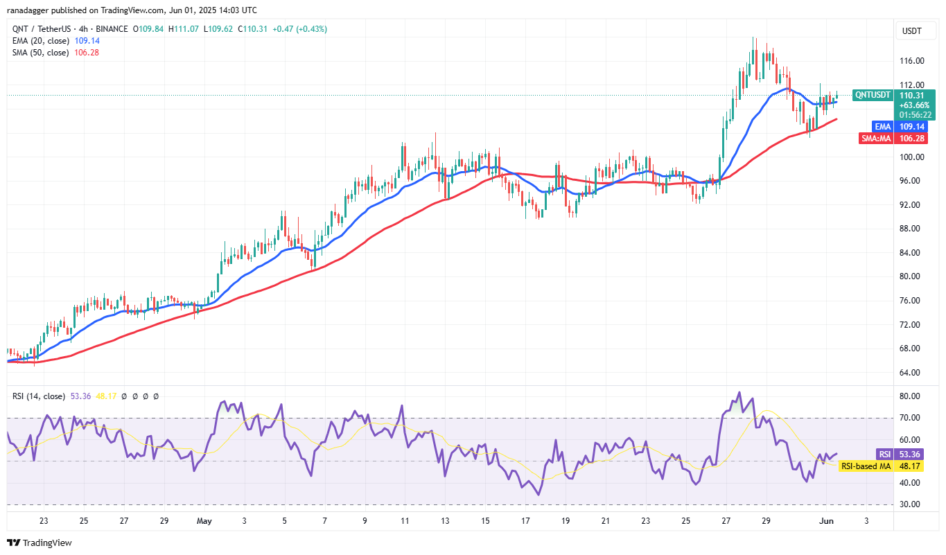 Quant (QNT) turned down from $120 on May 28, but the pullback is finding support at the 20-day EMA ($101).
