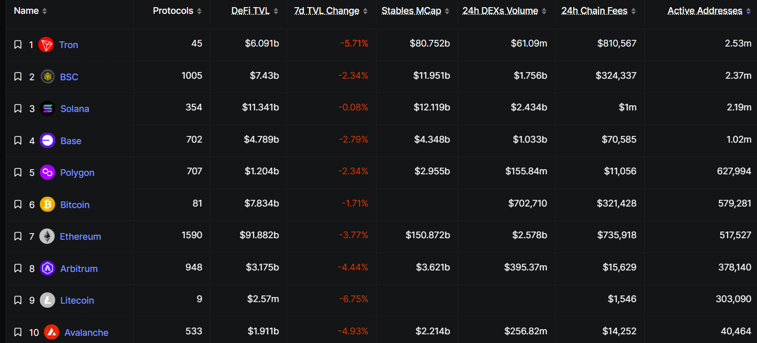 The Tron blockchain recorded roughly 2.5 million active addresses over the past 24 hours, giving it a lead over major networks, according to data from DeFiLlama.