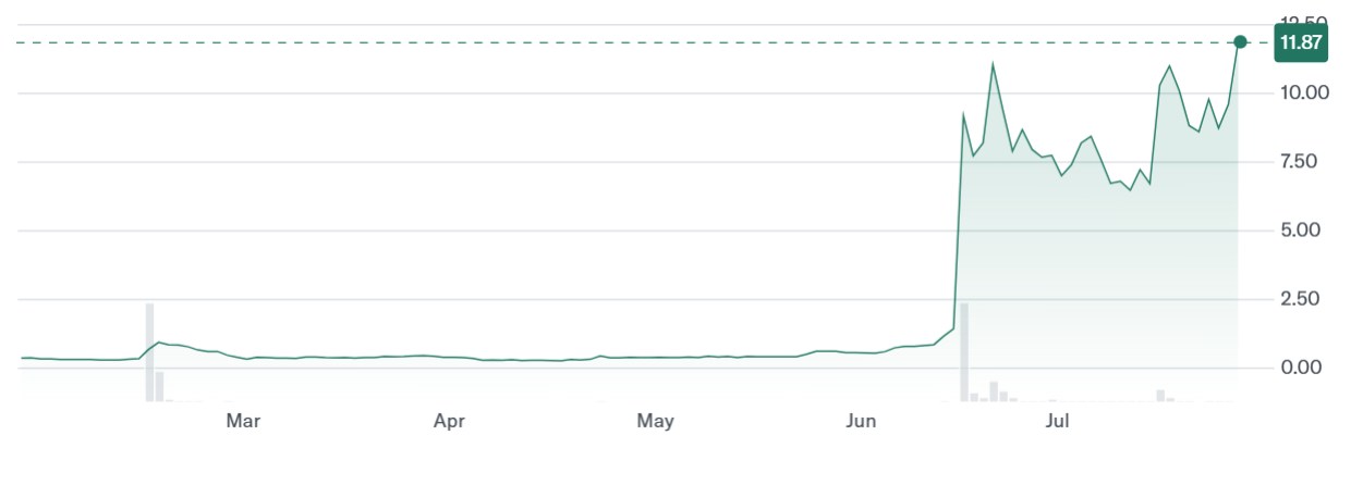 While TRX fell 5% on Monday, shares of Tron Inc. surged more than 23% on news of its funding application, trading above $11.80. Formerly a penny stock under the name SRM Entertainment, the company has rallied sharply since its reverse merger and rebranding. According to Yahoo Finance, the stock is up over 1,300% since June 10.