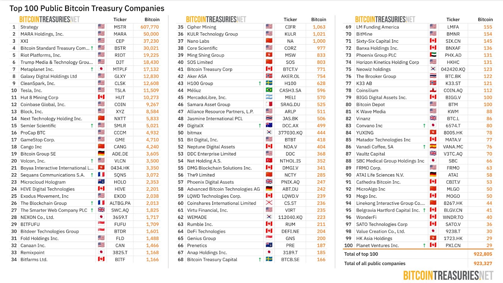 According to industry data, public companies, including Strategy and various Bitcoin miners, hold 923,327 BTC on their balance sheets as of July 28.
