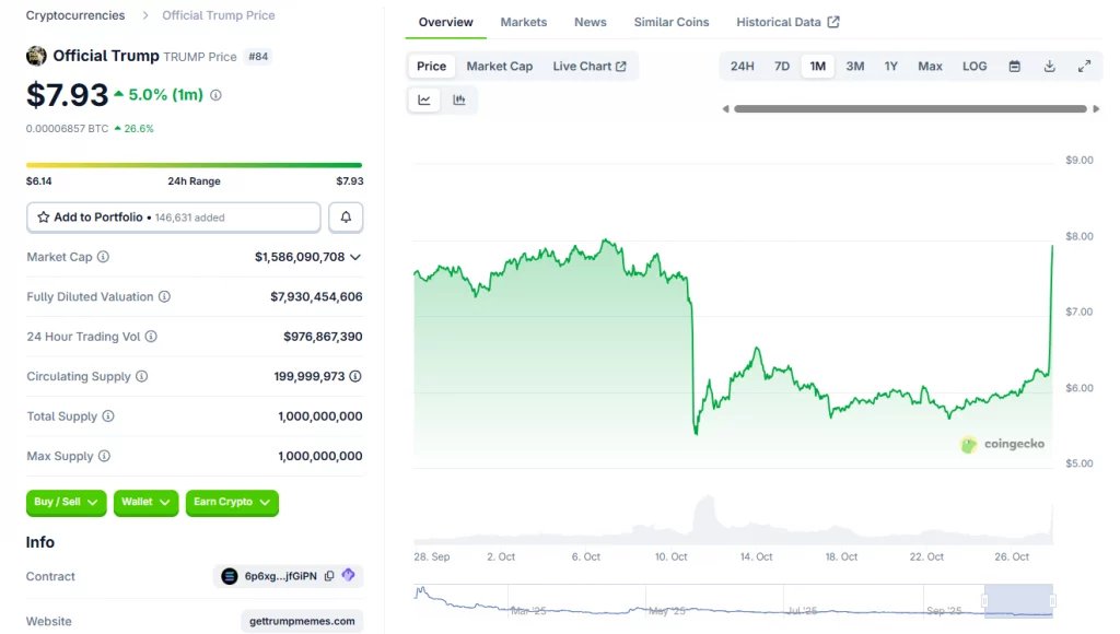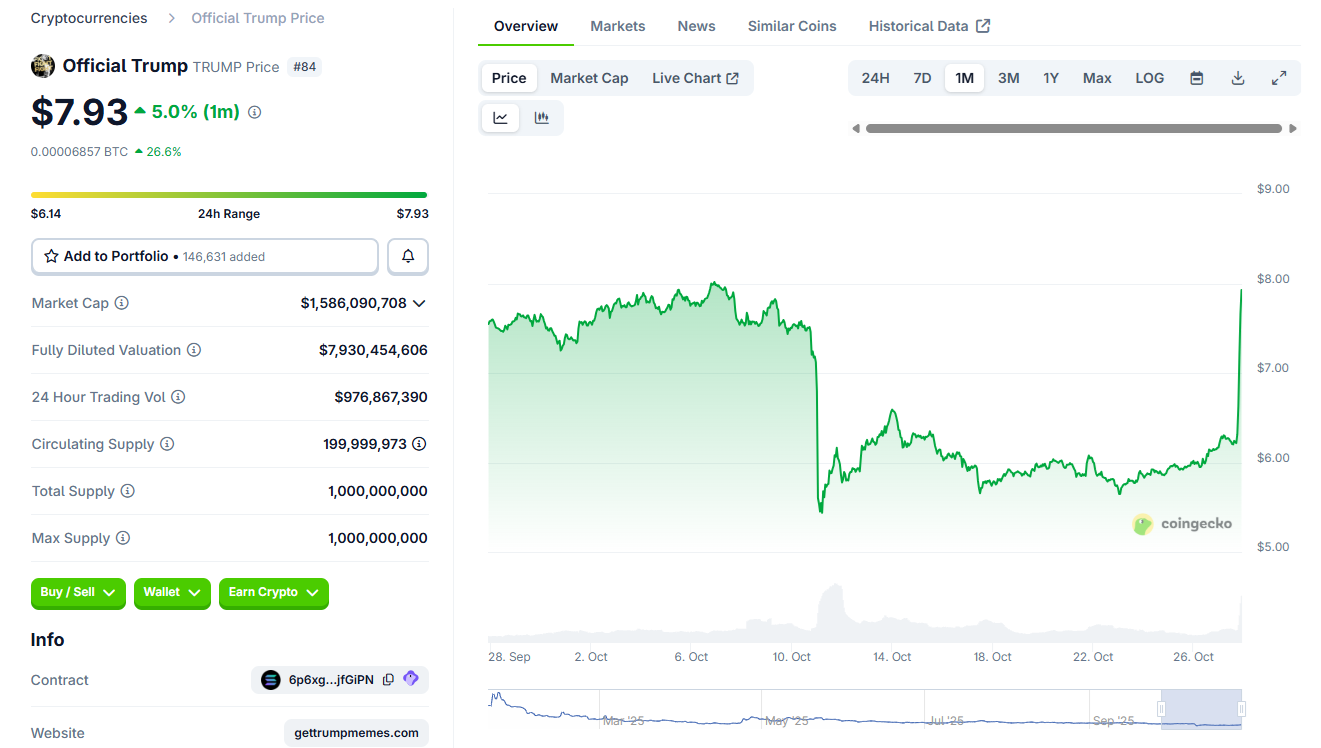 Official Trump (TRUMP) rallied by over 28% to $7.96. The token went vertical, rising close to a one-month high. This is the first significant recovery rally for TRUMP in the past three months, erasing a big share of the recent losses.