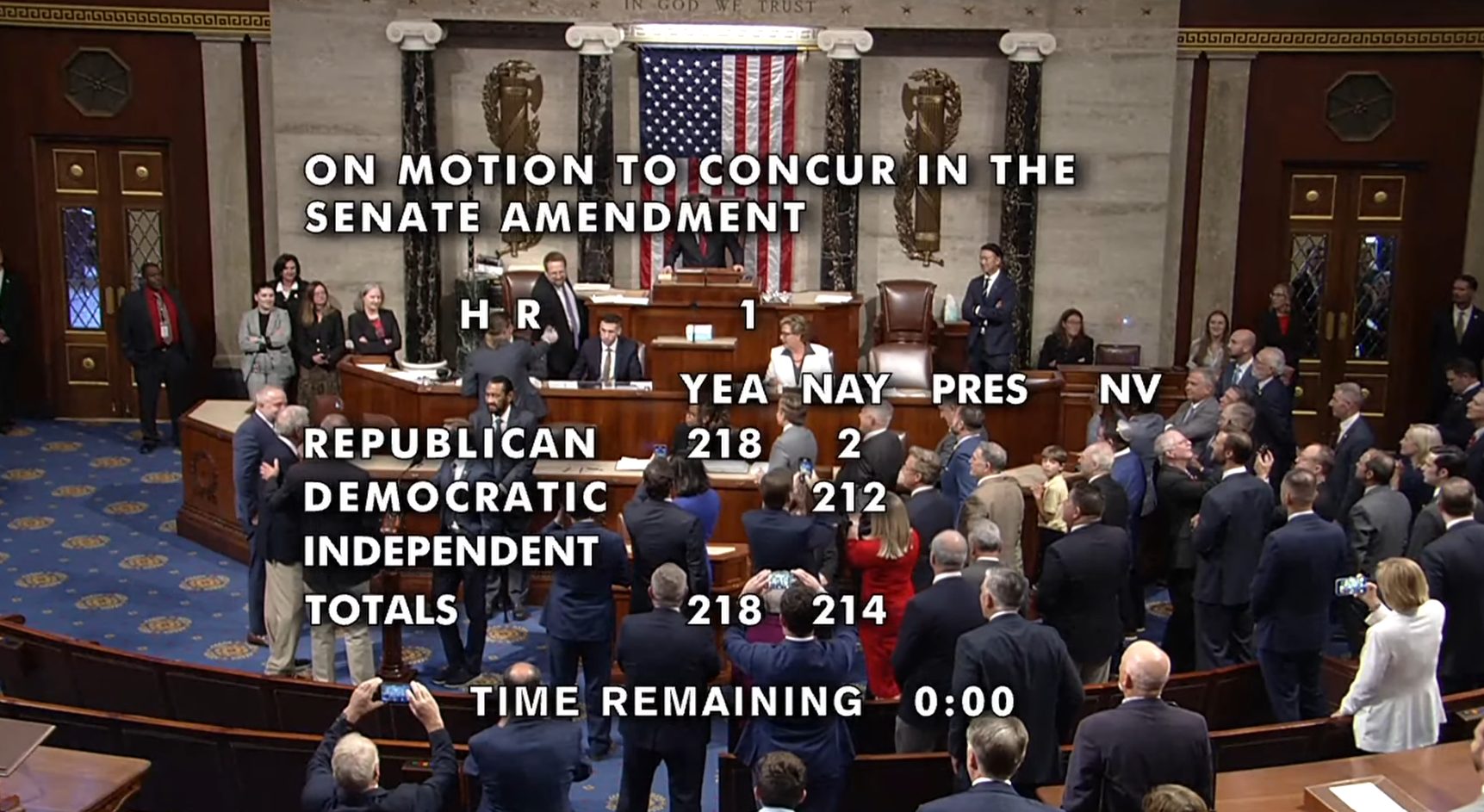 Two Republican representatives, Brian Fitzpatrick of Pennsylvania and Thomas Massie of Kentucky, crossed party lines to vote with Democrats against the measure, which had already cleared the Senate earlier this week.