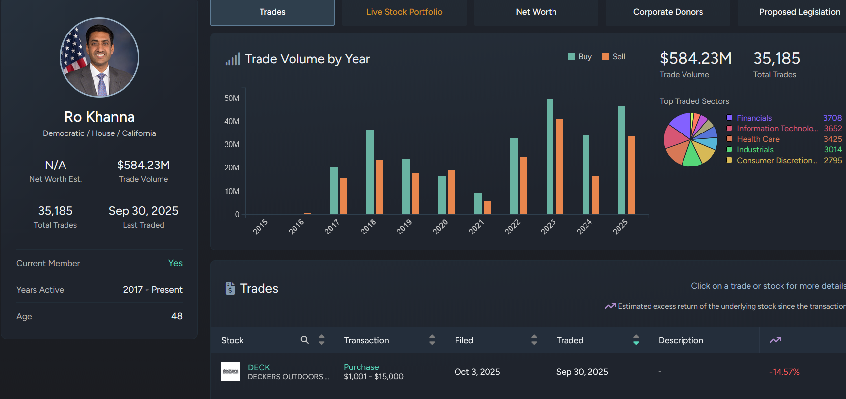 According to data from Quiver Quant, Khanna himself has notched up $80.3 million worth of stock trade volume in 2025.