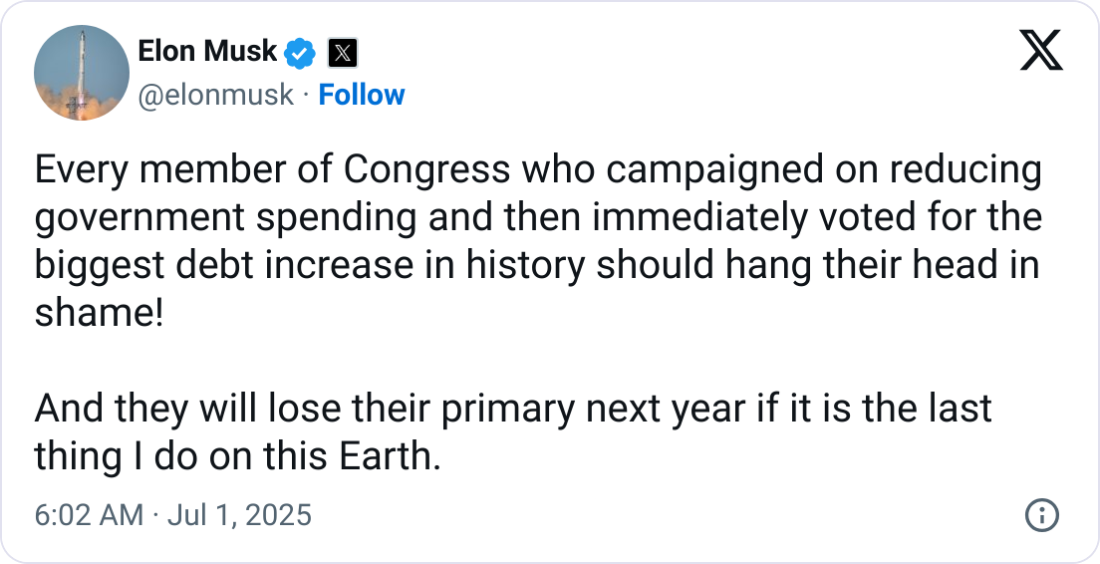 “Every member of Congress who campaigned on reducing government spending and then immediately voted for the biggest debt increase in history should hang their head in shame!” Musk wrote.