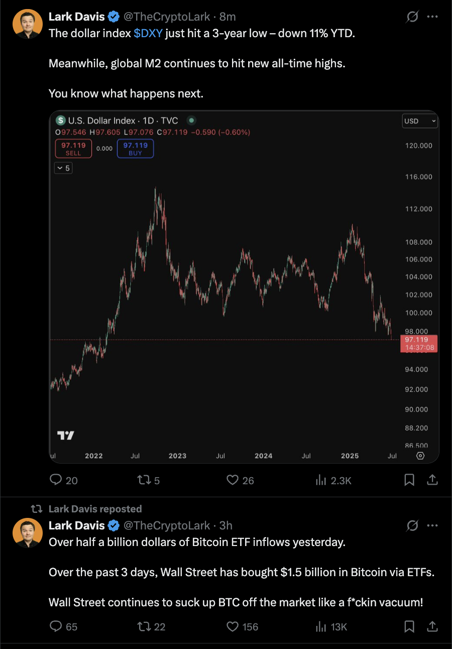 The dollar’s outlook, combined with with an increase M2 supply, could prompt Wall Street investors “to suck up BTC off the market like a f***ing vacuum,” notes analyst Lark Davis in a series of X posts.