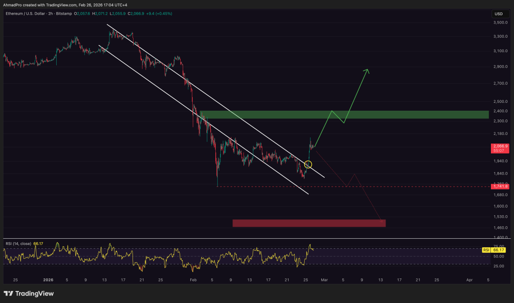 The 15% jump to $2,050 has reshaped the chart. ETH has reclaimed the $2,000 level, flipping it back into support. That is the key shift. The next resistance sits near $2,150. Clear that cleanly and the path toward $2,400 opens up with less friction.