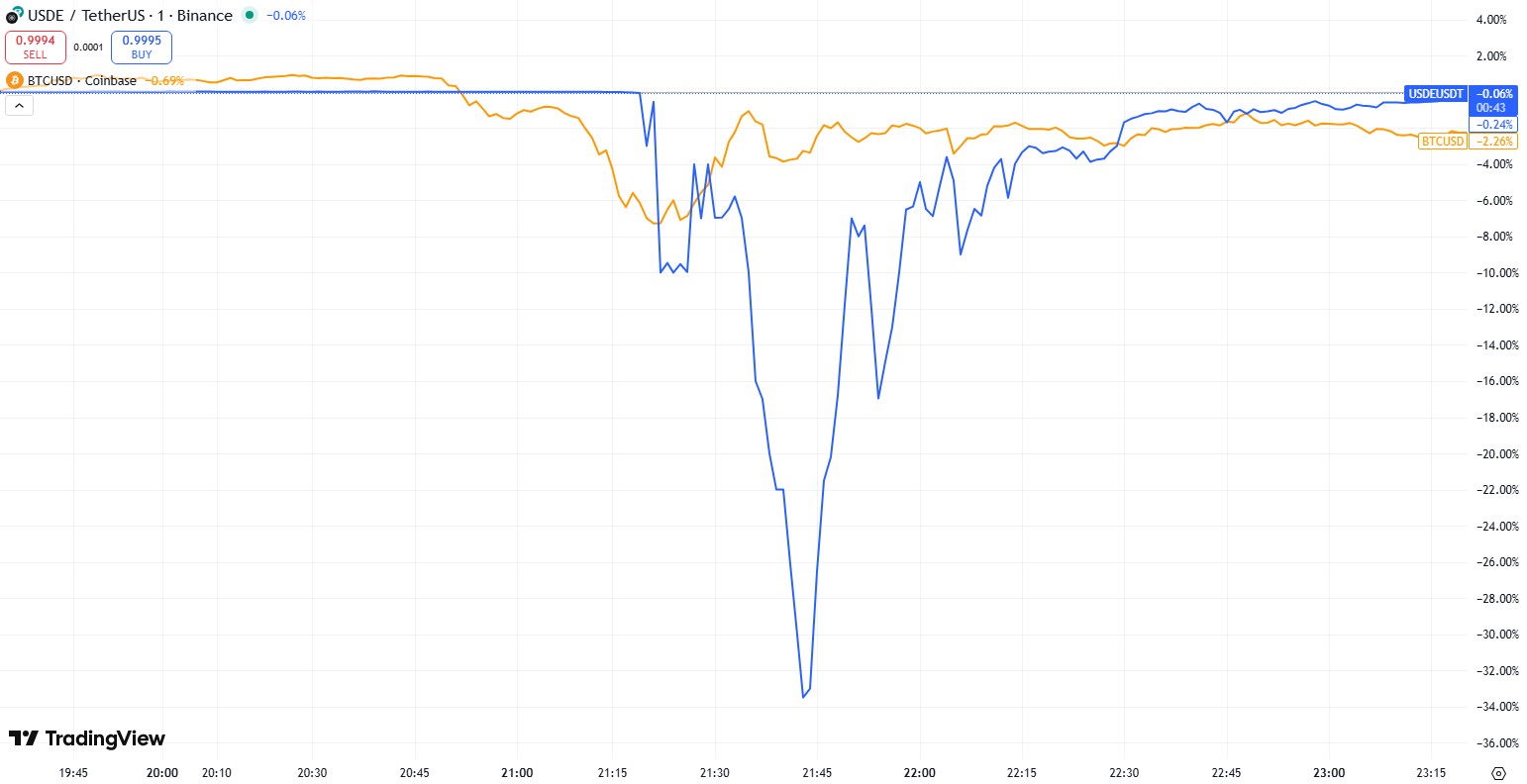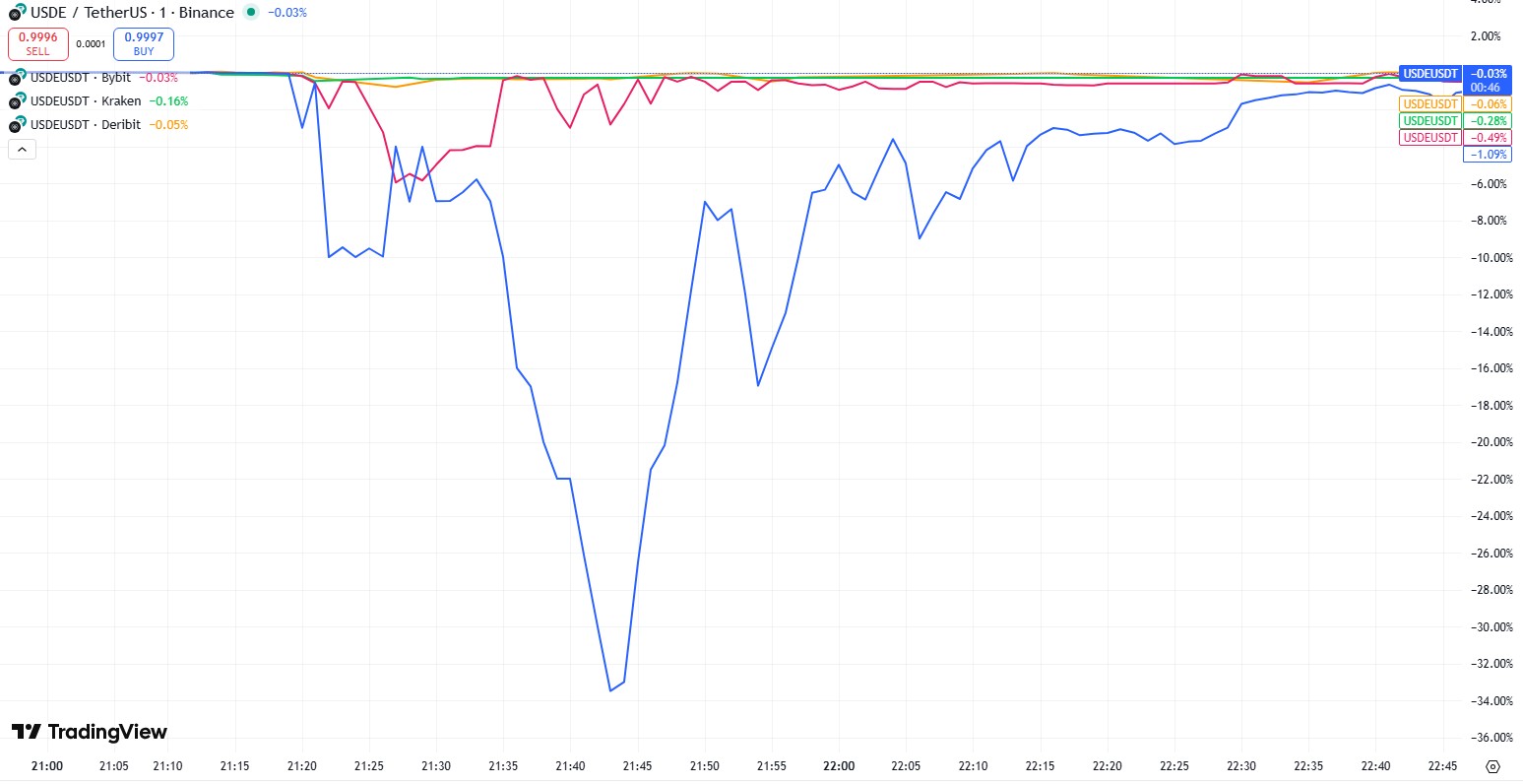 One of the key flashpoints was USDe, Ethena’s synthetic dollar, which maintains its peg to the greenback through a delta-neutral strategy in the perpetual futures market. On Friday, USDe appeared to lose parity, plunging to $0.65, but that was primarily visible on Binance. Across other exchanges, USDe traded with the kind of mild volatility typical of dollar-pegged tokens during turbulent market conditions.