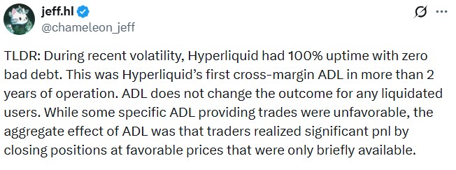 Hyperliquid founder Jeff Yan defended his exchange by stating that it functioned as designed, maintaining 100% uptime and zero bad debt throughout the turmoil.