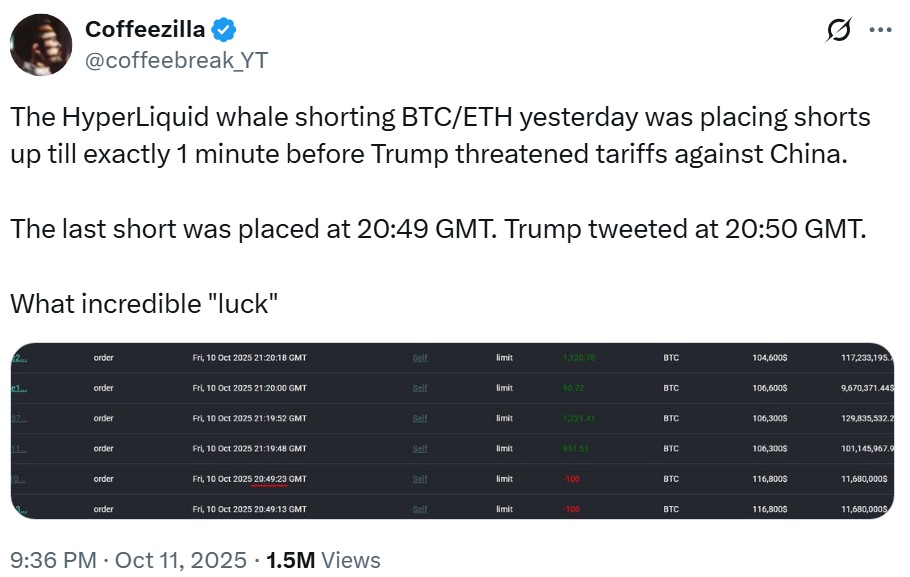 The timing of these trades has led many in the crypto community to label the trader an “insider whale,” with some speculating that their positions may have even contributed to the $19-billion liquidation cascade over the weekend.