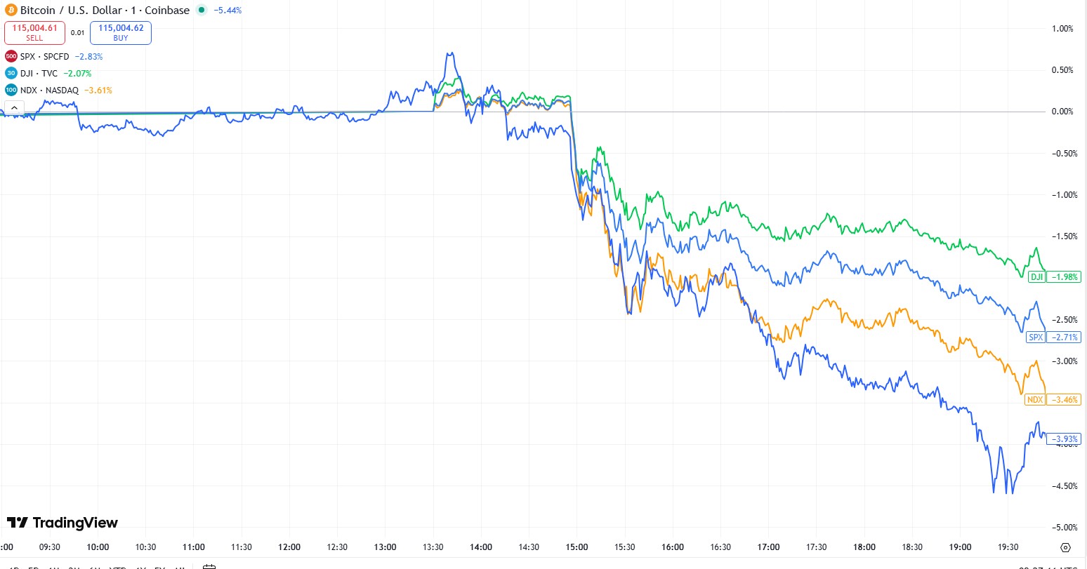 In crypto, some analysts believe the market downturn that same day was triggered by an industry-specific price oracle malfunction rather than Trump’s tariff threat. However, a comparison with traditional finance indexes reveals that the sell-off was not confined to crypto.