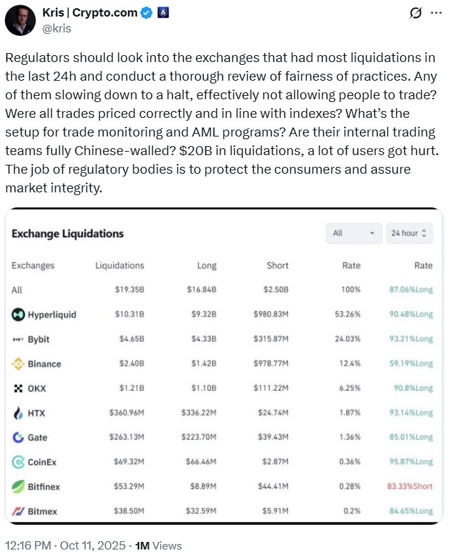 Hyperliquid was also listed as the leading venue where most liquidations occurred during the $19-billion cascade, prompting Kris Marszalek, CEO of Crypto.com, to call for an investigation into top derivatives platforms.