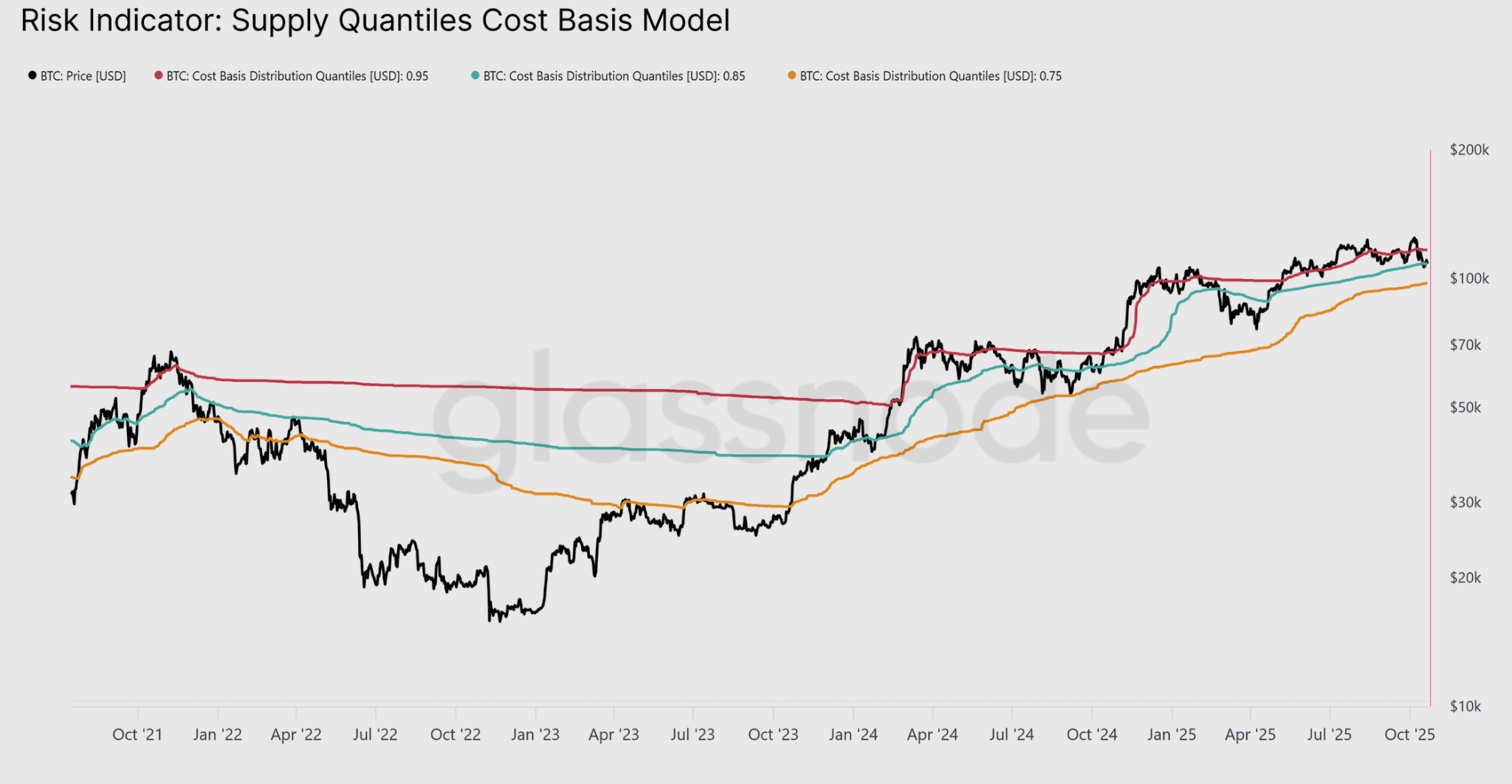 “Historically, failure to hold this threshold has signalled structural market weakness and often preceded deeper corrections toward the 0.75 quantile, which now aligns near $97.5K.”