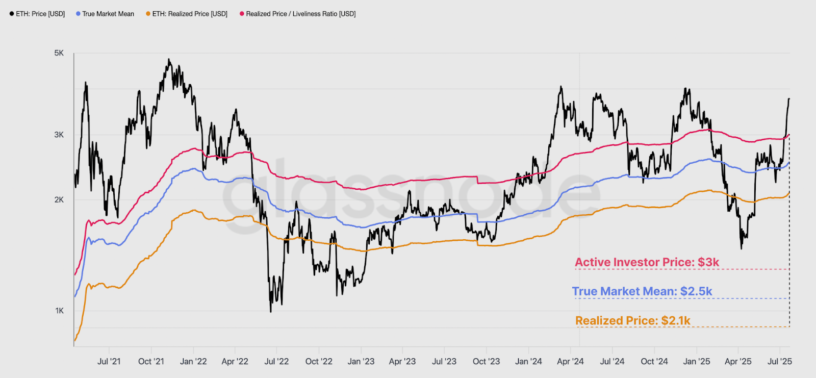 On the downside, the major support level sits between $2,000 and $3,000, represented by the realized price at $2,100, the true market mean at $2,500, and the active realized price at $3,000.