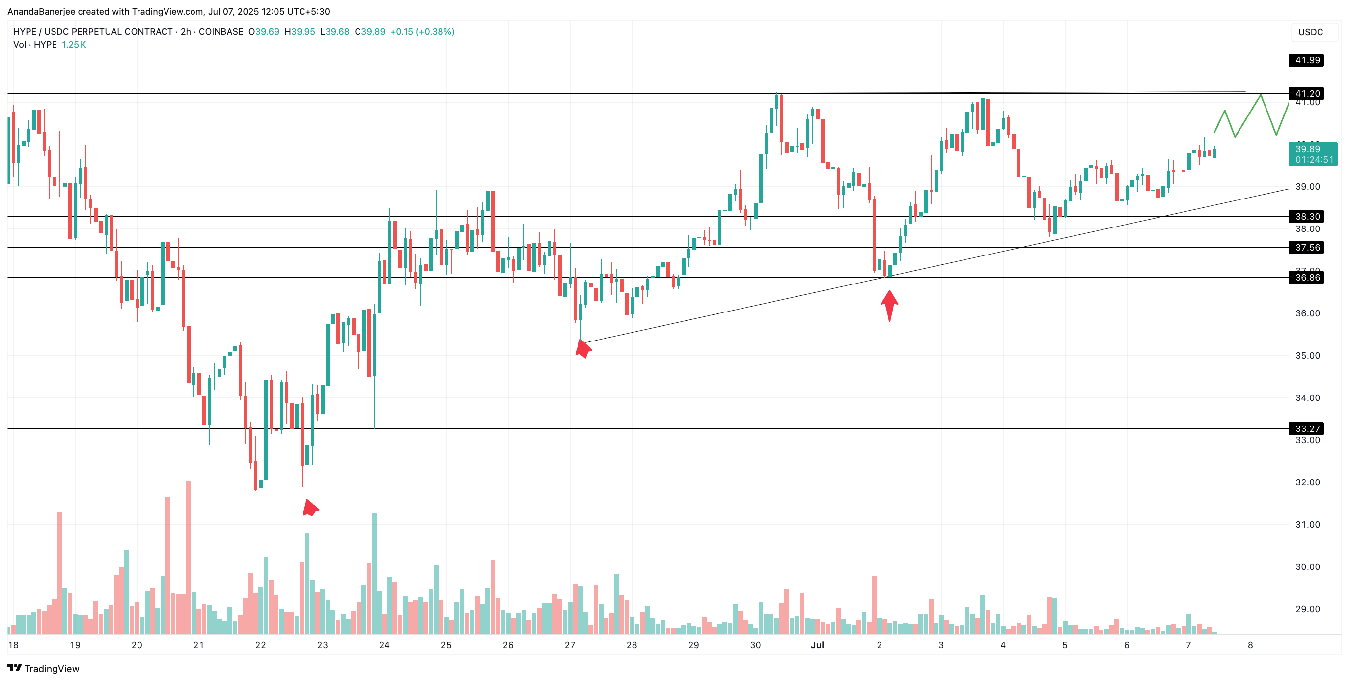HYPE continues to trade within a rising wedge in the hourly timeframe, with higher lows since June 27 and resistance forming near $41. If the price breaks above the wedge and holds above $42 with volume, shorts could face a violent squeeze.