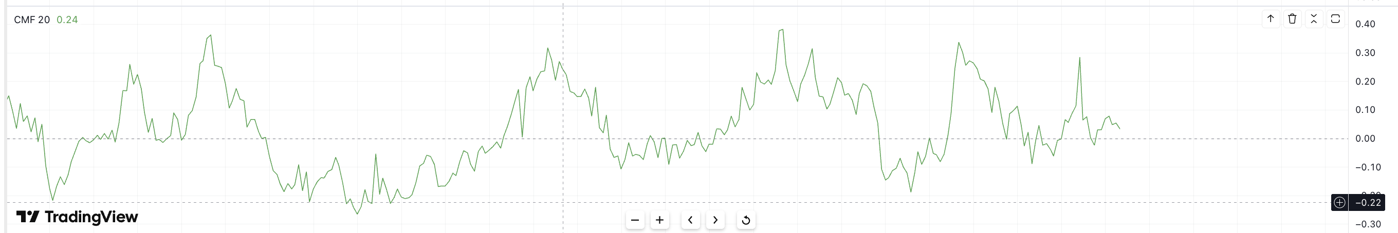 The Chaikin Money Flow (CMF), a TradingView indicator that tracks volume-weighted inflows versus outflows, has remained above the zero line for some time now. That signals buying strength. CMF doesn’t just follow price; it tracks capital flow. A positive CMF during sideways consolidation indicates that Smart Money is still accumulating while the price remains stable.